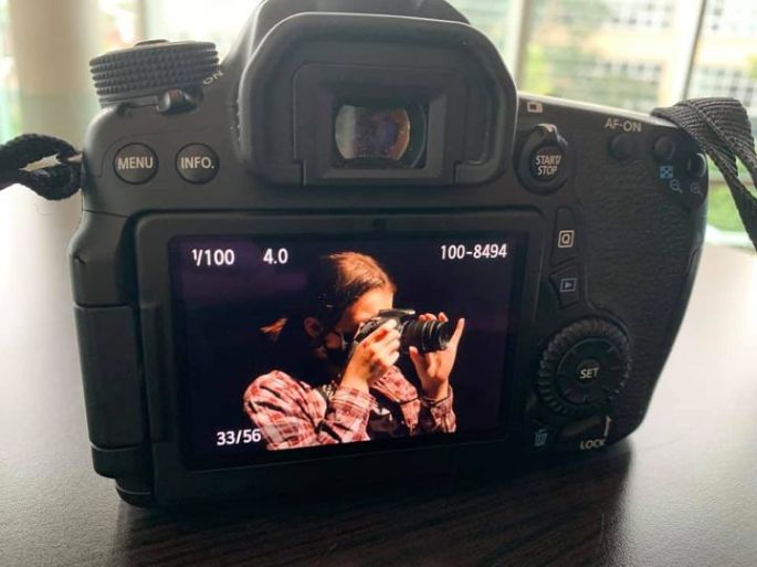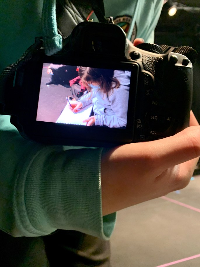 [Image Descriptions, Left to Right: 1. A black camera with a screen that shows a young photographer taking photos during rehearsal; 2. A sketch artist wearing a colorful mask, headphones around their neck and a dark grey hoodie holds up their black & white sketch of a scene in 12; 3. A photographer’s in a green hoodie holds a camera and within the camera is her sister sketching rehearsal for 12]