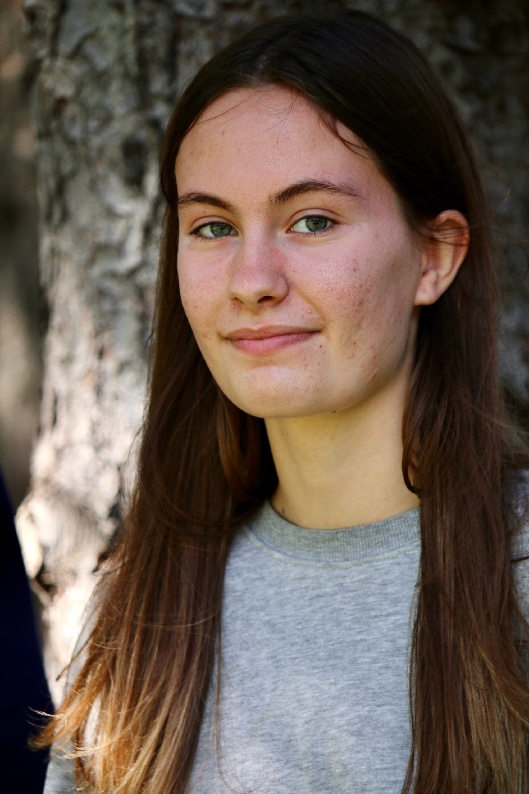 [Image Description: a youth with long brown/blond hair, green eyes and wearing a grey top. She smiles at the camera. She is outside, in front of a tree.]