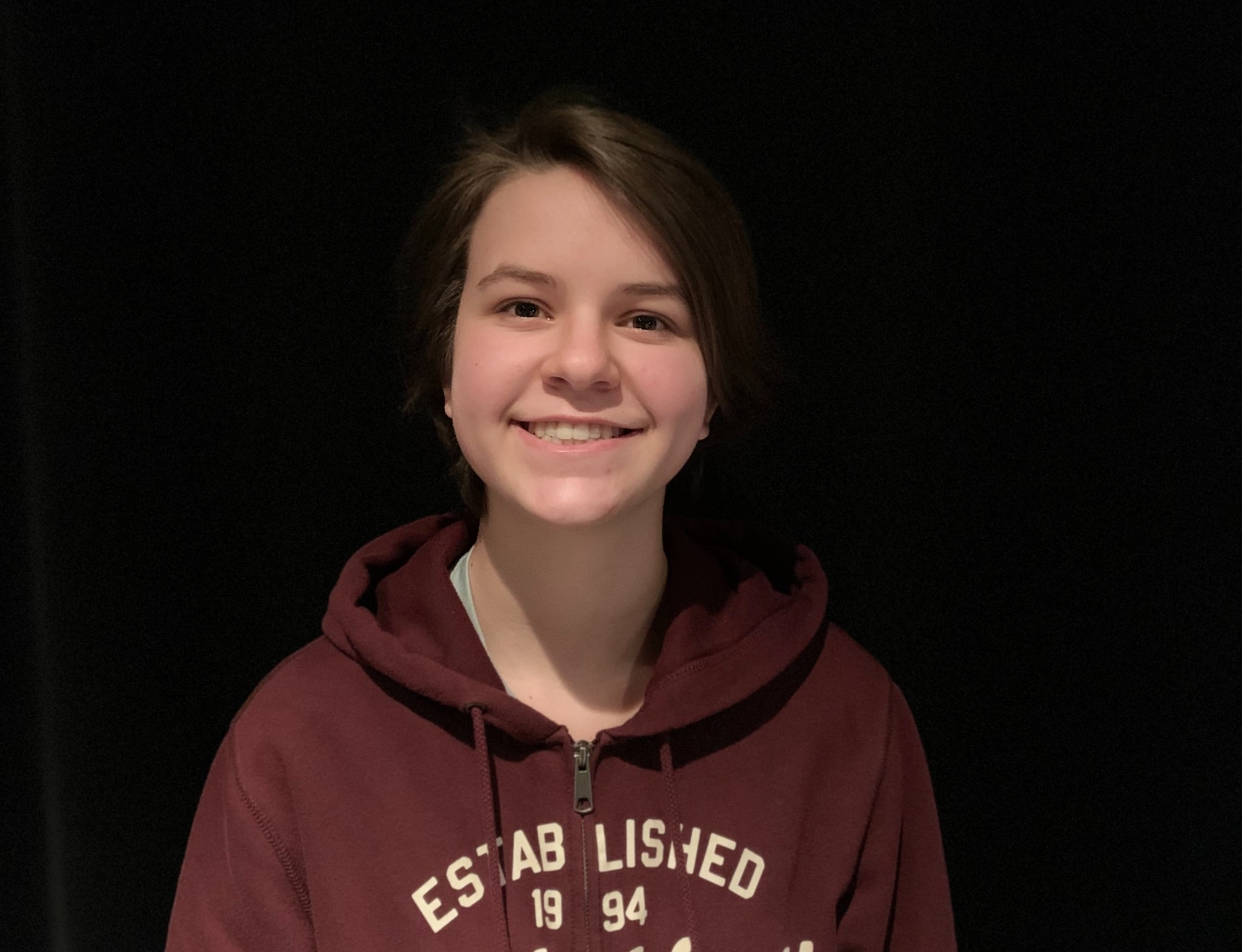 [Image Description: a youth with short brown hair smiles. They wear a burgundy hoodie]