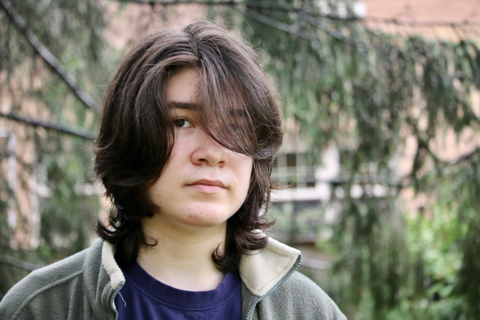 [Image Description: a youth with dark brown shoulder-length hair stands in front of a tree. He wears a purple t-shirt with a jacket on top.]