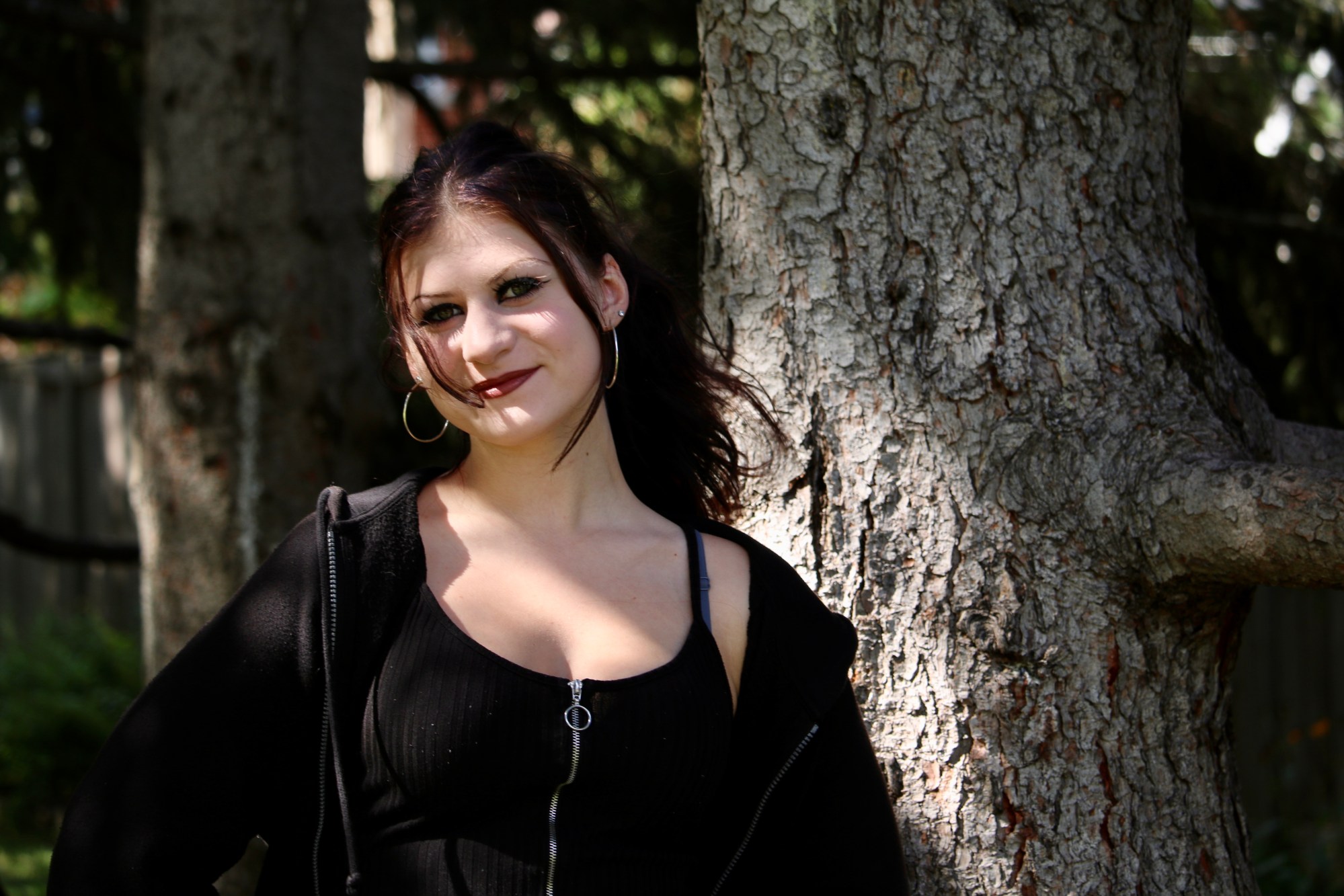 [Image Description: a youth with black hair and wearing a black top & hoodie. She stands, smiling, beside a tree]