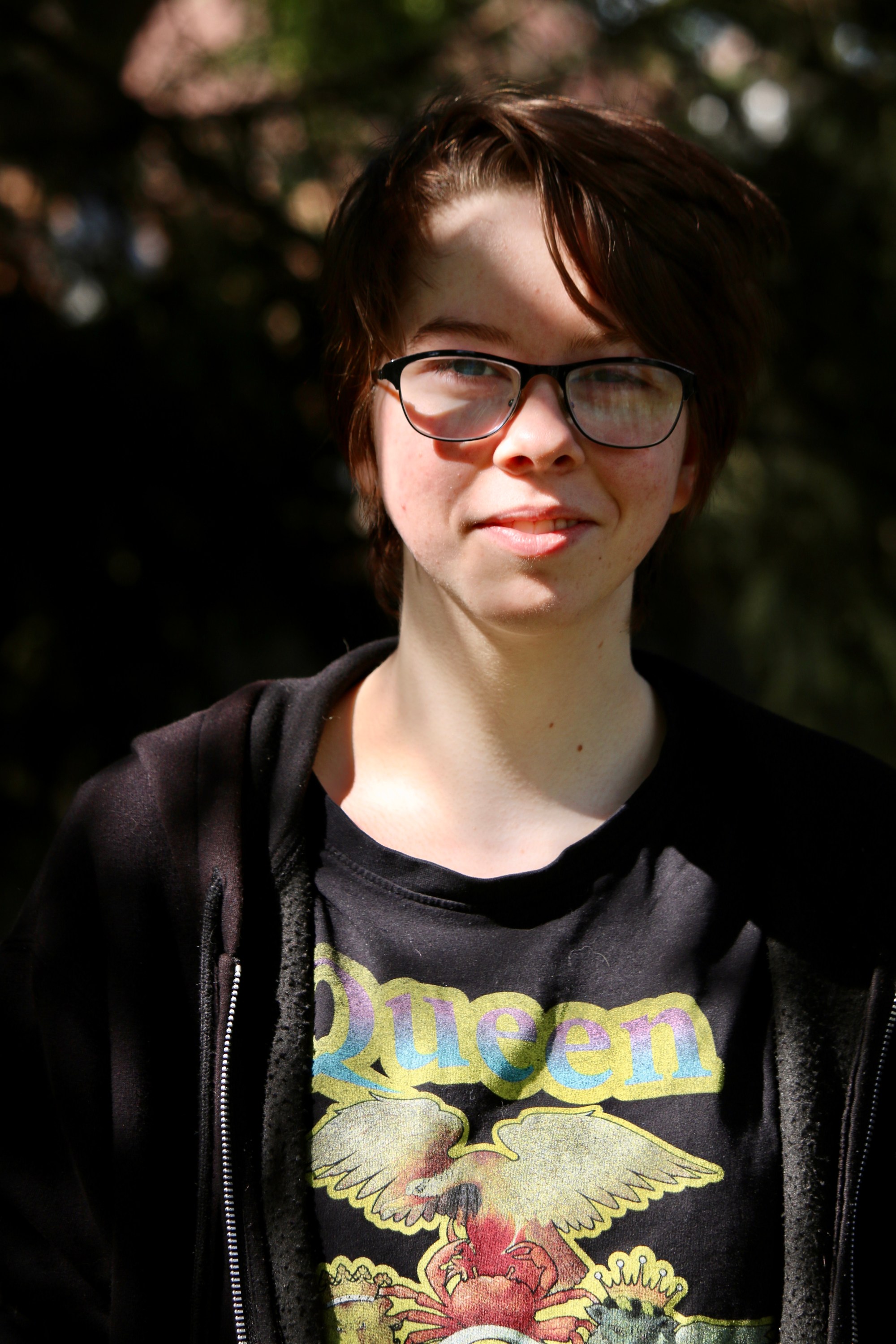 [Image Description: a youth with short hair and wearing a black hoodie and a t-shirt that says “queen”. They stand, smiling, in front of a tree]