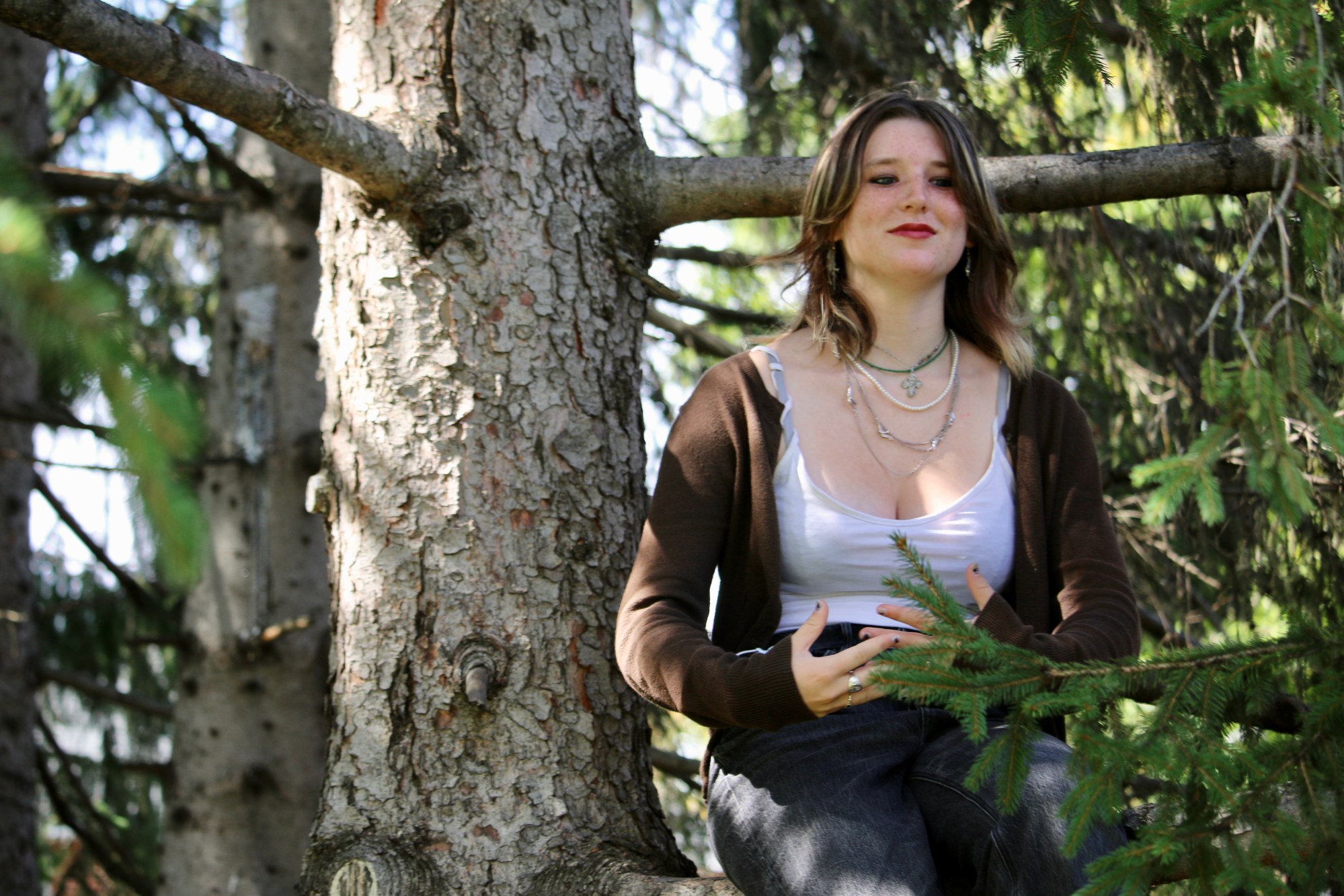 [Image Description: a youth with brown/blond hair and wearing a brown sweater & multiple necklaces she its, smiling, on the branch of a tree]