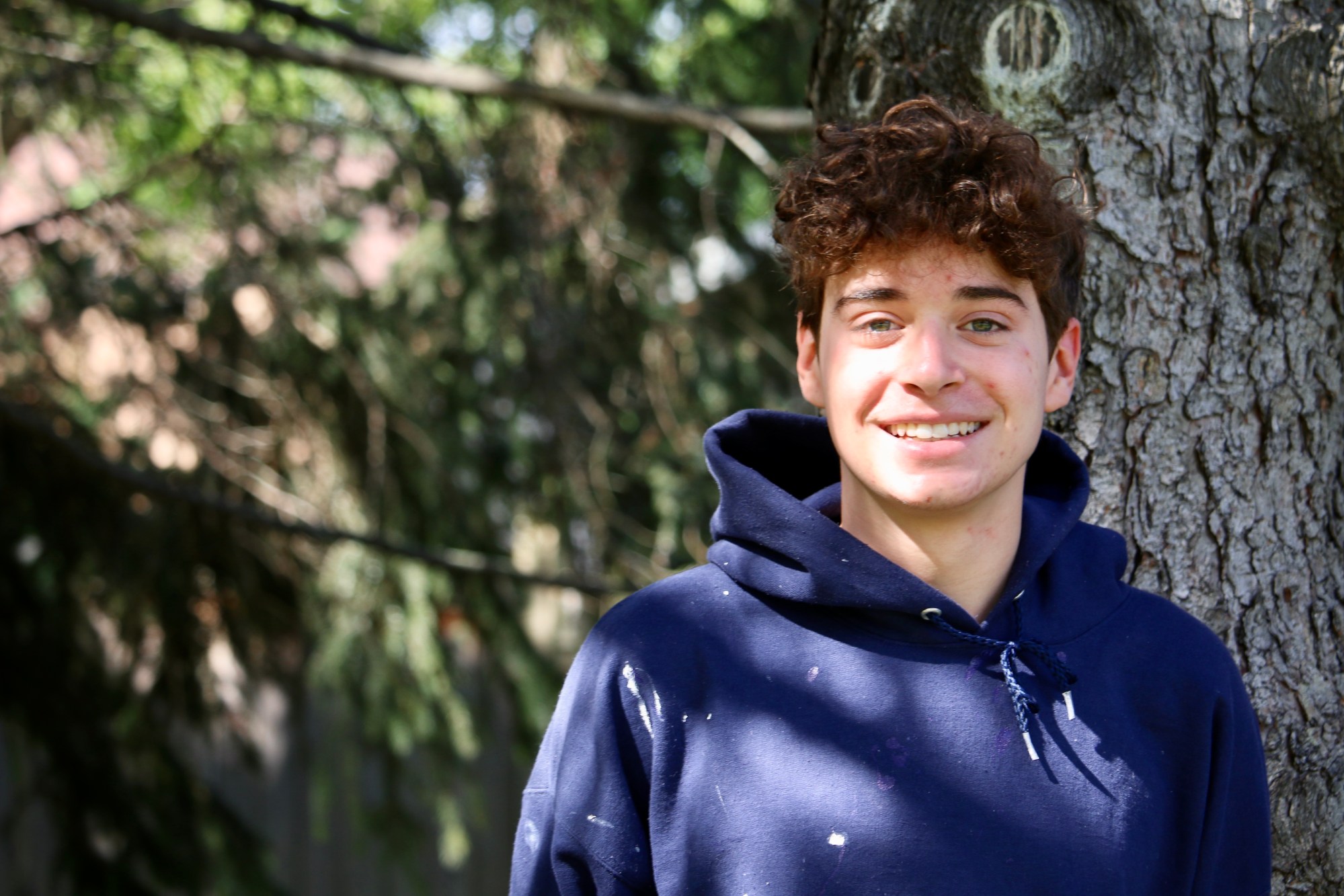 [Image Description: a youth stands against a tree. They have curly blond hair and wear a blue hoodie. They smile]