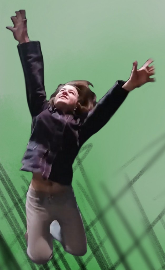 [Image Descriptions above: the first 9 images are of youth who stand, sit, jump and play guitar with a sketched background that is part of a landfill mountain with a green sky above. The 10th image is of a woman with dark brown shoulder-length hair, who leans on a tree branch and smiles]