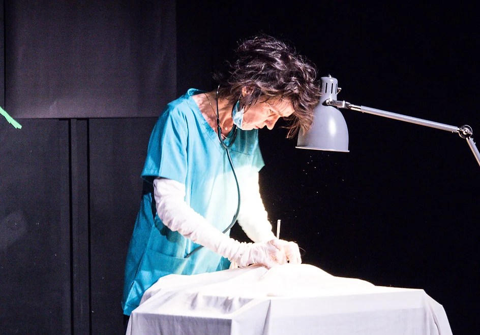 [Image Description: a woman played by Kristina Watt, dressed in turquoise scrubs and dark brown hair at a microphone; a drummer, Mike Essoudry, sits at his set to the right of the woman]