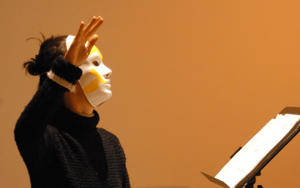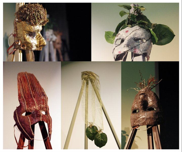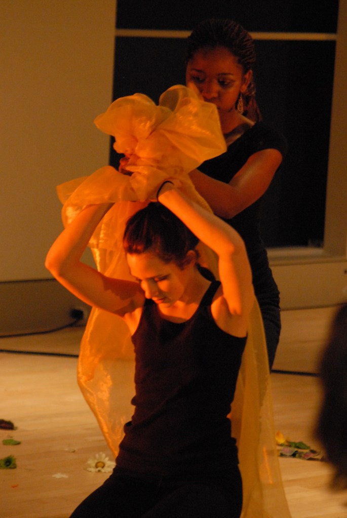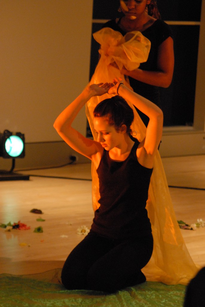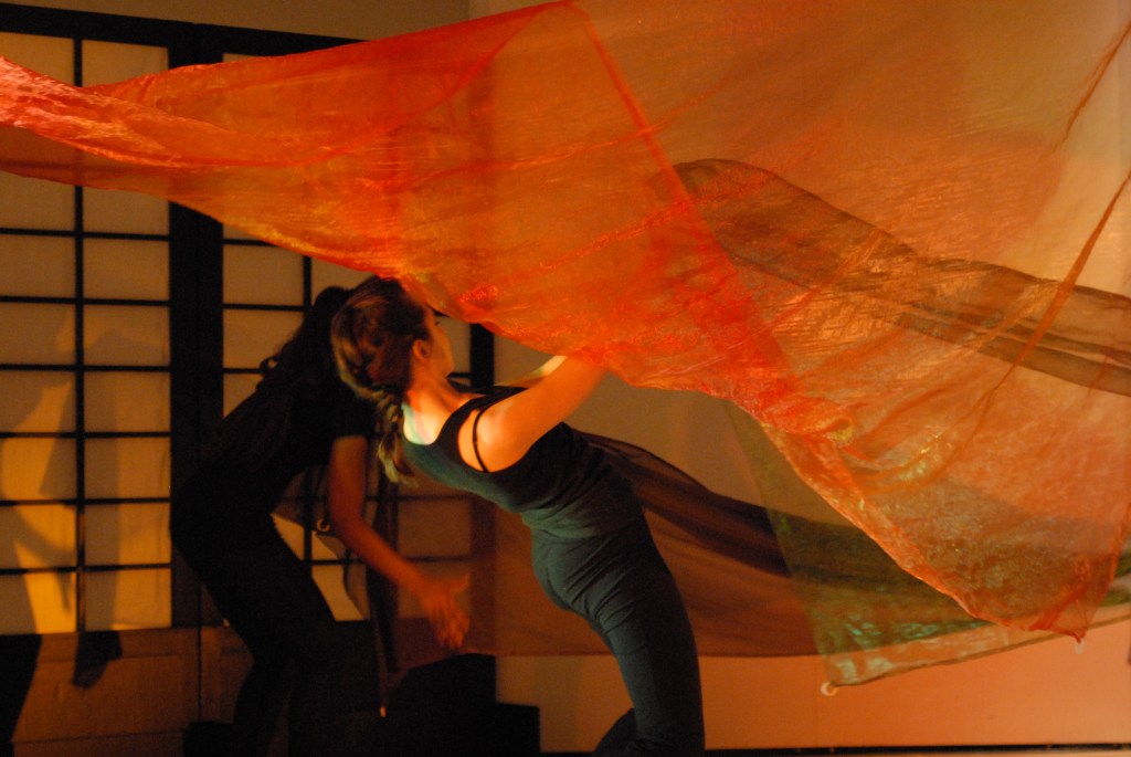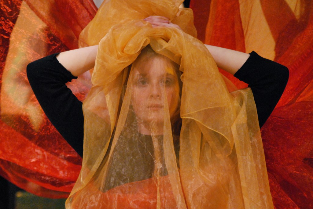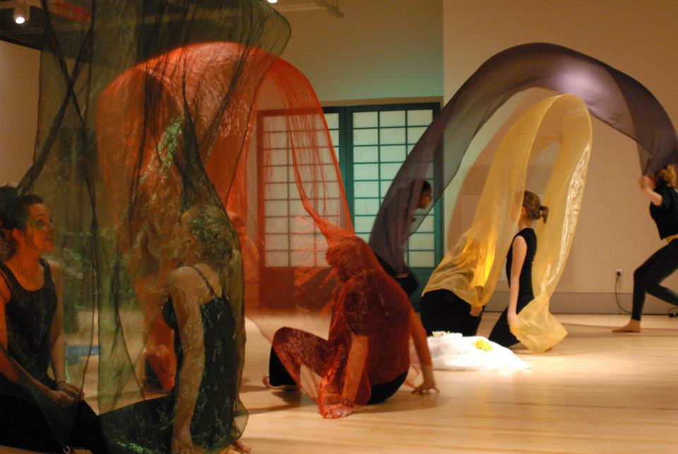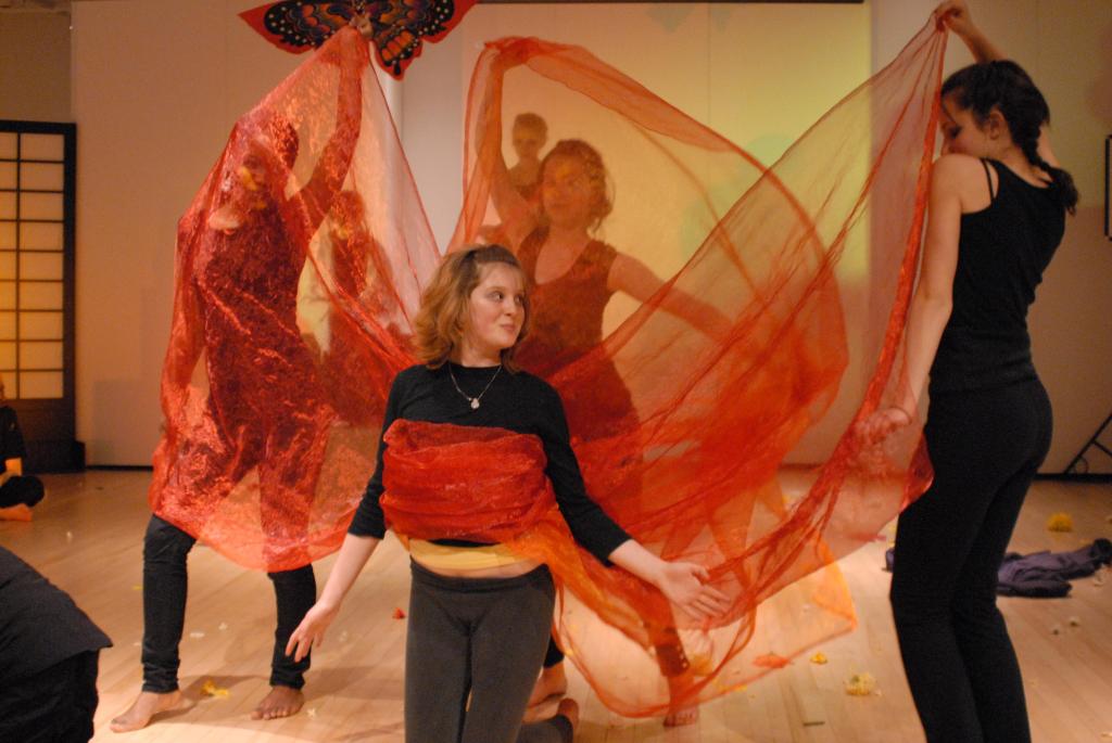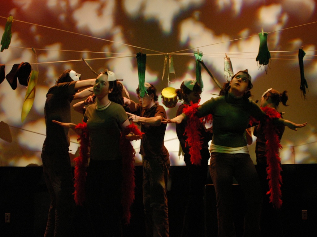 [ID: Seven youth flutter in a circle, arms outstretched like birds, they wear red boas. They have white face masks on their foreheads. Above them are ropes that intersect with fabric pinned to it like a clothes line. Behind is a white screen with a foliage shadow projected upon it.]