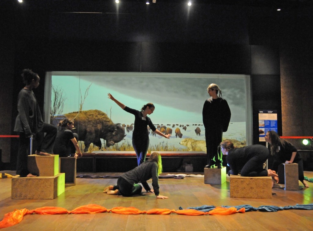 [ID: Seven youth wearing black pants and long sleeve shirts crouch and stand on blocks in front of the Nature Museum’s bison exhibit. There are colourful fabrics at the front of the stage.]