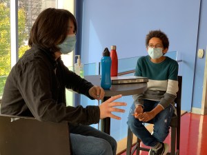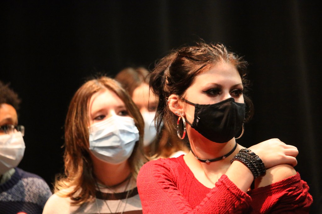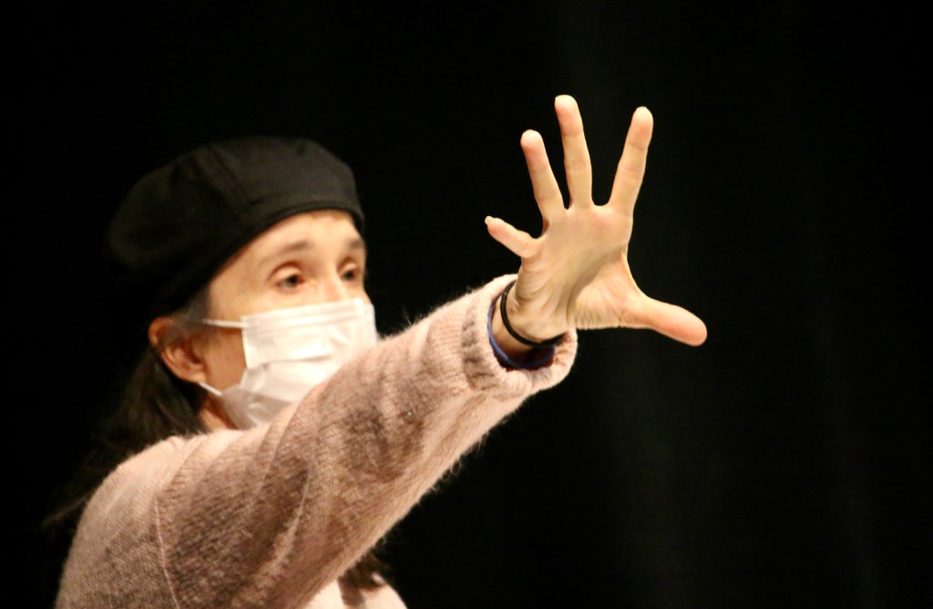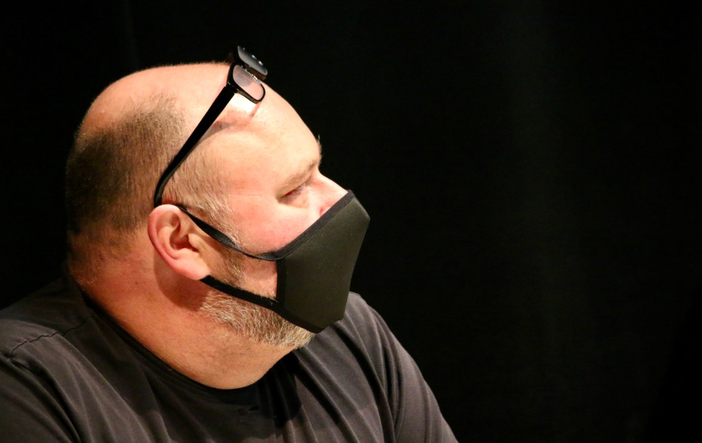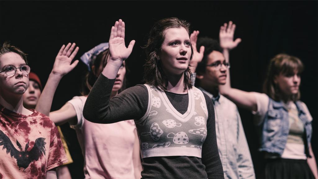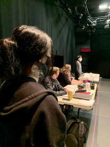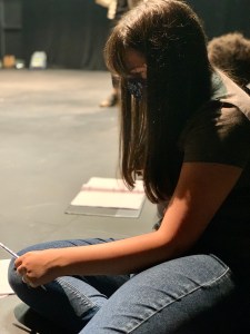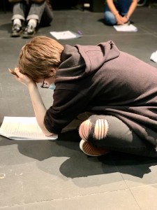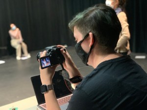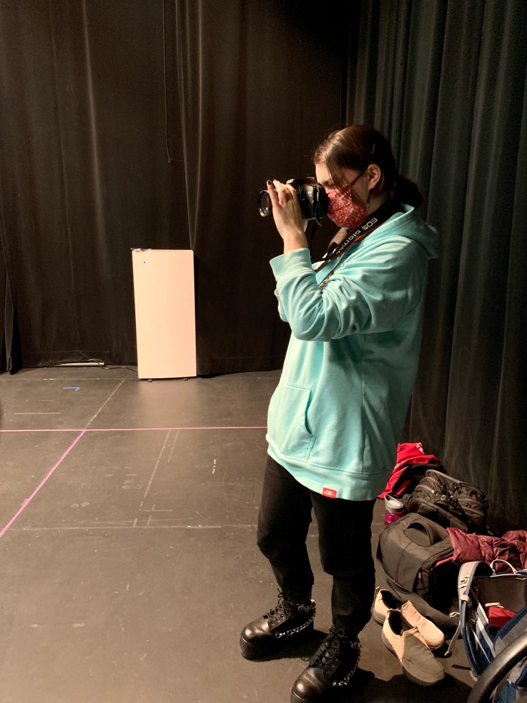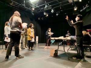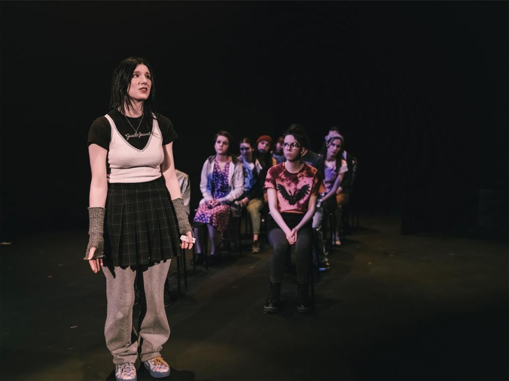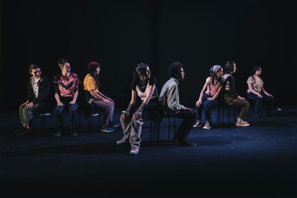 IMAGE DESCRIPPTIONS OF PHOTOS 1.Three youth lie on a black stage floor; 2. Black & white image of eight youth standing in a circle looking up and out; 3. A row of youth sit beside each other looking out; 4. Four youth sit up, trying to stand; 5. A young actor, Quinn, sits and thinks. He wears a grey hoodie. 6. A row of youth line up and read off of a small piece of white paper; 7. Two youth sit on the theatre floor with their scripts. There are chairs behind them; 8. A girl with long brown hair sits, reads her script; 9. A youth in a burgundy hat stands and speaks, mouth open; 10. A group of youth stand in a circle, facing out; 11. Five actors stand in a line wearing bright casual clothing; 12. In a studio theatre room, actors sit on the floor and a director stands in front of a white table; 13. A line of youth stand and speak, holding scripts; 14. A Stage Manager holds her camera, filming a room of actors; 15. A youth stands with his arm in the air, wearing a checked shirt and glasses; 16. Five actors stand in a line, masked; 17. Seven actors face a black curtained wall, and one actor stand away from them and faces out; 18. A woman with dark brown hair and a beige jacket smiles; 19. Actors stand with their scripts in a rehearsal studio as the director guides them, arms in the air; 20. Production team of 4 people sit at two long white tables with various objects and books, as one actor in the forefront looks at them; 21. Two youth sit on chairs at a tall table and talk, masked; 22. A youth wearing a black t-shirt and checkered pants sits at a table, touches her dark hair; 23. A black & white image of a row of youth who either look down or look out; 24. A group of people stand outside a theatre building with a marquee that says GCTC, they pose for a group picture. 25. A young photographer in a turquoise hoodie and boots stands and takes photos; 26. A black camera with a square screen that shows the image of a photographer taking photos; 27. A girl with dark pants and a white t-shirt confronts a group of youth who stand watching, wearing masks; 28. Actors in a black studio wearing masks, some in a clump and one close to the camera who is confronting them in a scene; the director and SM watch from behind long white tables; 29. A woman, Kristina, has a hand and arm extended; she wears a black cap, mask and peach sweater; 30. A man, the sound designer, sits at a table, wears a black t-shirt and black mask, and has his glasses on his head; 31. Four actors stand looking out, wearing different colored tops; 32. Nine actors stand in a line, one with a script and the others looking ahead; they wear casual and colored tops, and masks.