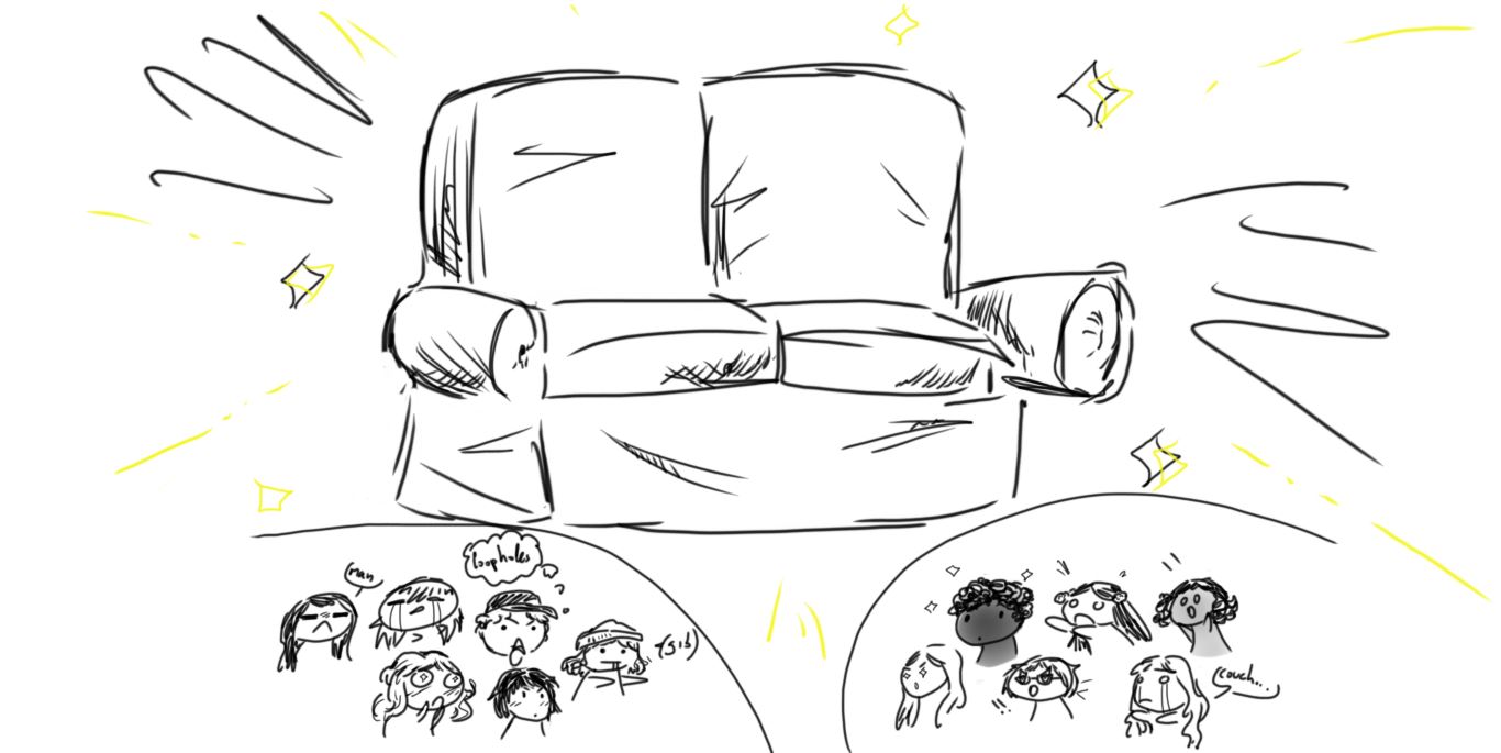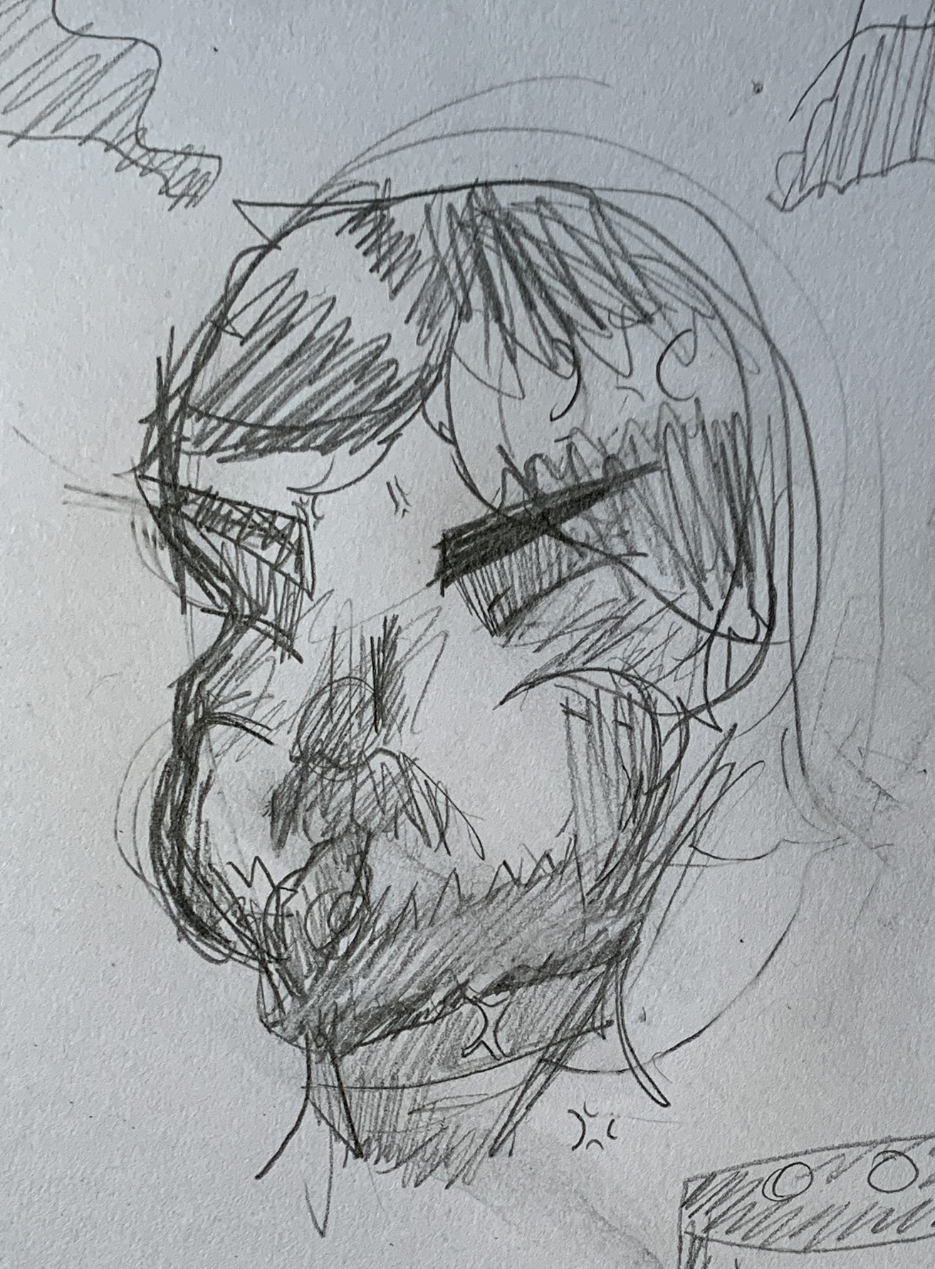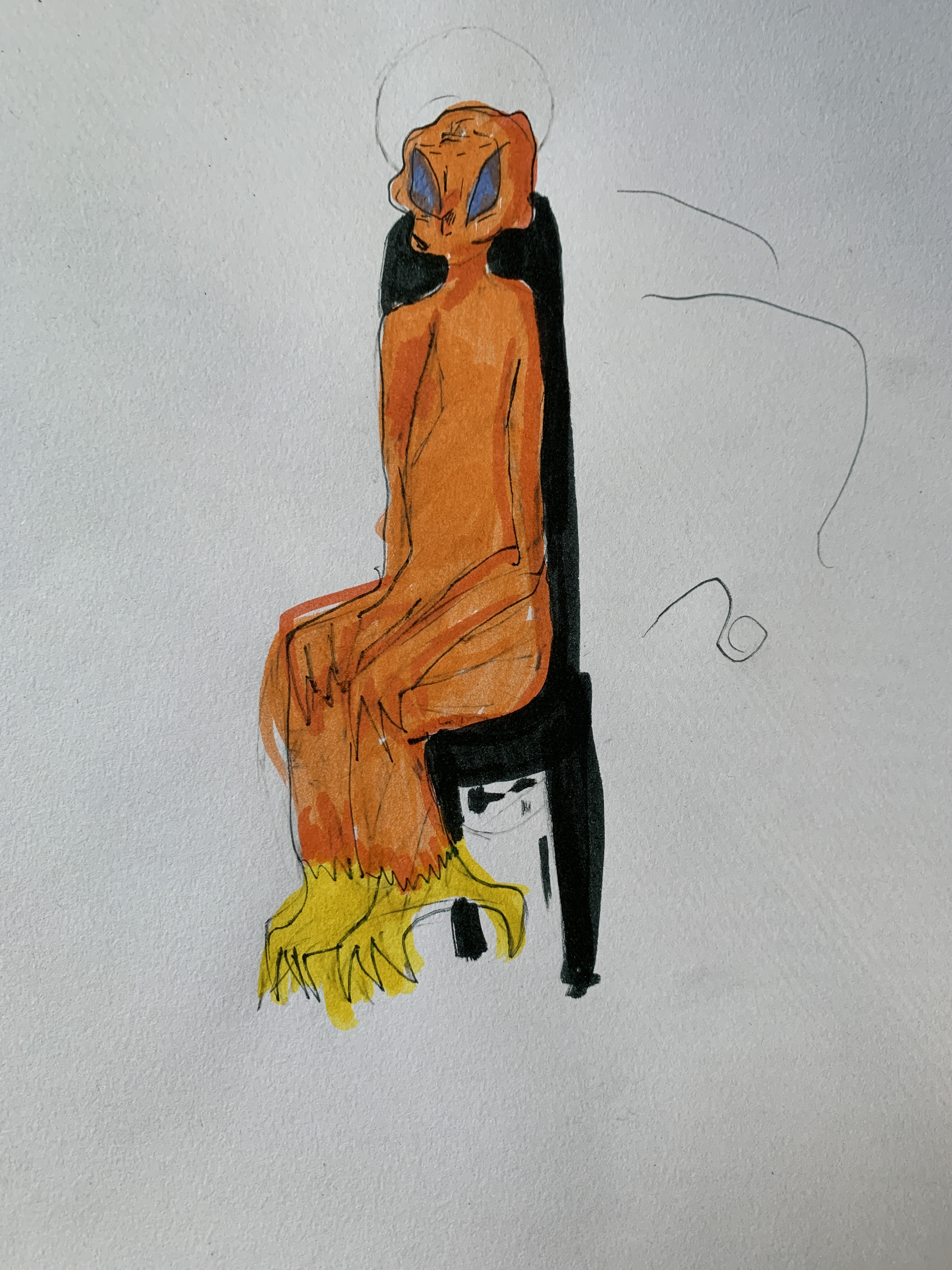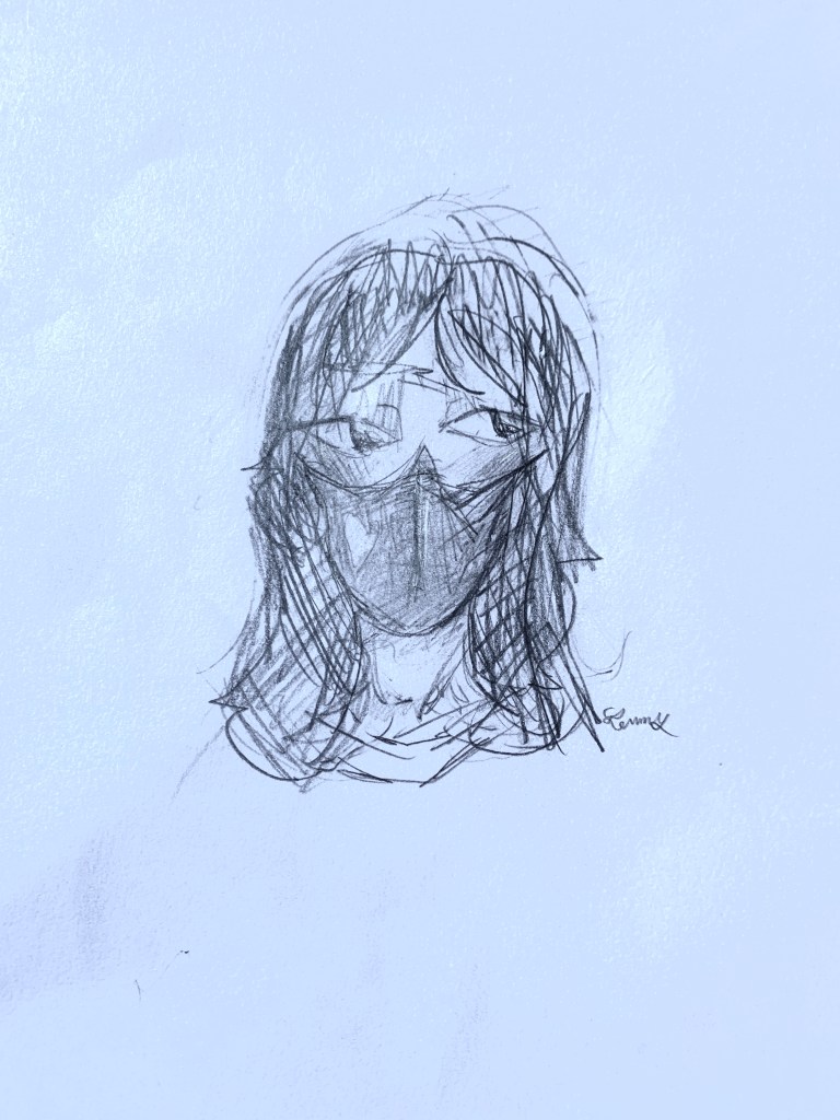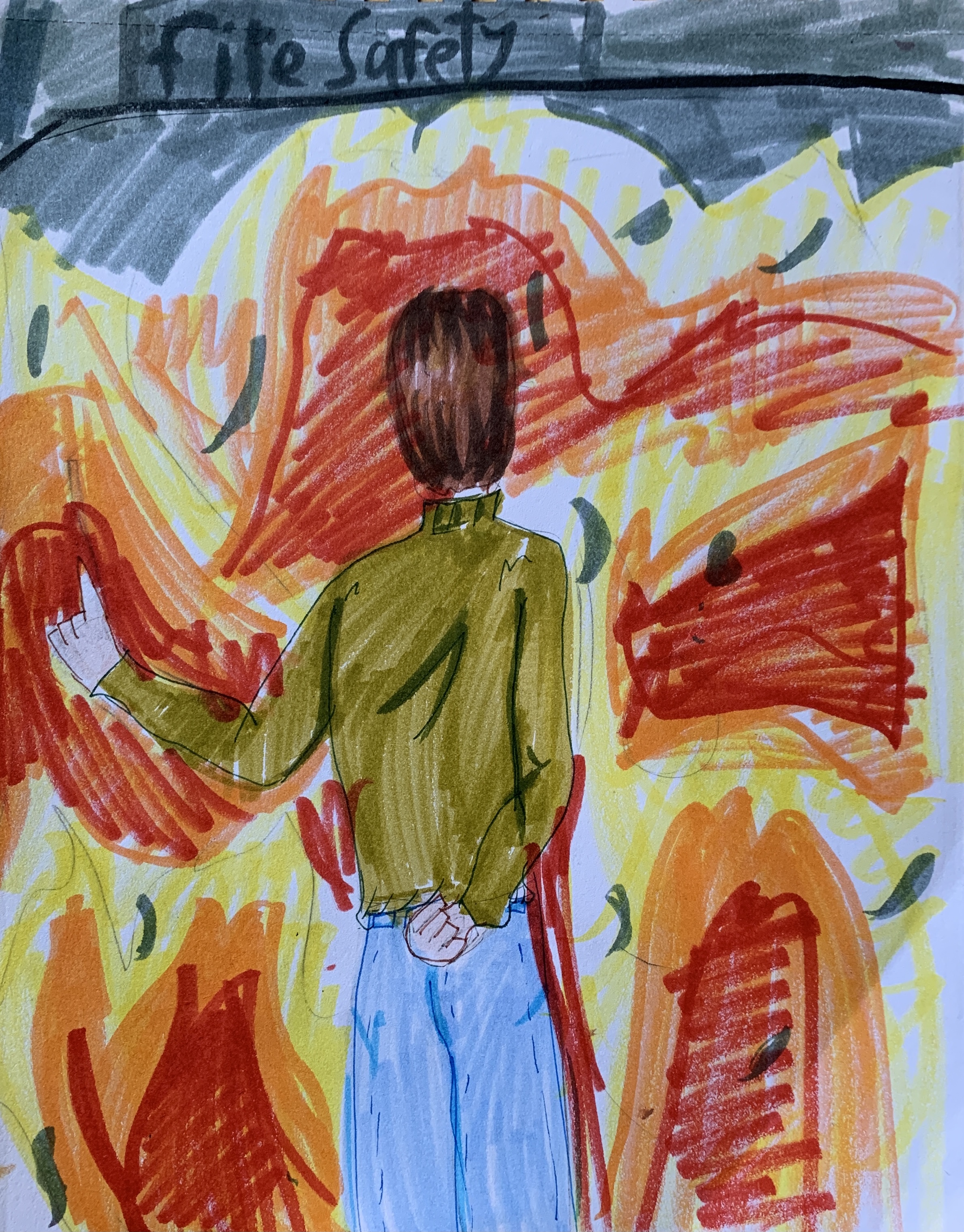 IMAGE DESCRIPTIONS OF SKETCHES/VISUAL ART 1. A color sketch of a person standing with their backs to the viewer, flames surround them. A sign above says โFire Safetyโ; 2. A group of people stand together looking up, there are eyes in the sky above them; blue color; 3. A line sketch of a sofa with two groups of heads below it with thought bubbles & reactions; 4. A line sketch of a head and neck of a person who blows a whistle, distended cheeks; 5. An orange figure sits on a black chair; they have claw feet and blue eyes; 6. Between two black horizontal bands are boxes of cartoon faces, masked, and objects; 7. A sketch drawing of two youth side by side. One, Ana Clara has long hair and looks out; Raluca has curly hair and has her back to us; 8. A sketch of two girls, side by side and smiling: Anna with long hair and Raluca with curly hair. 9-17. Individual sketches of the heads & faces of 9 of the actors in the cast, all sketched with pencil. The images have a blue hue. In the sketches, all the actors wear masks and their eyes are drawn very prominently.