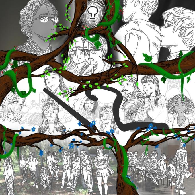 [Image Description: a poster for โ12โ โ a drawing in black & white with green, anime-style faces of youth, looking up and at each other; a tree trunk vine moves between them. A hand-drawn lightbulb glows in the center top of the poster.]